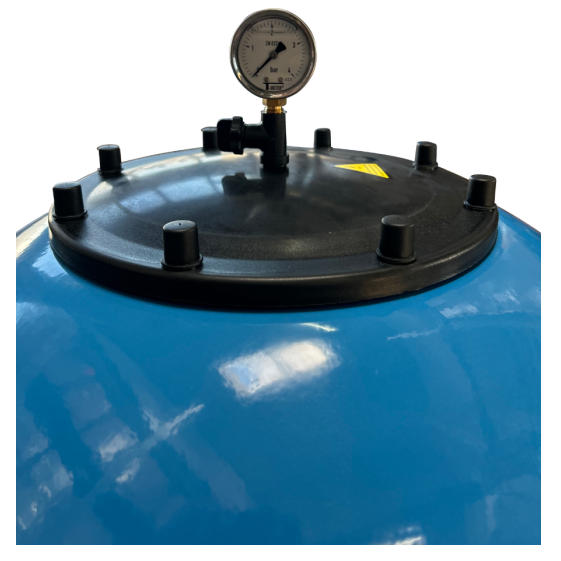 Entleerung, Entlüftung, seitliches Mannloch und Schauloch aus Acrylglas. Komplett mit 6-Wege-Ventil. Betriebsdruck 1,5 bar. Maximaler Druck 2,5 bar. Maximale Betriebstemperatur 40°C.
