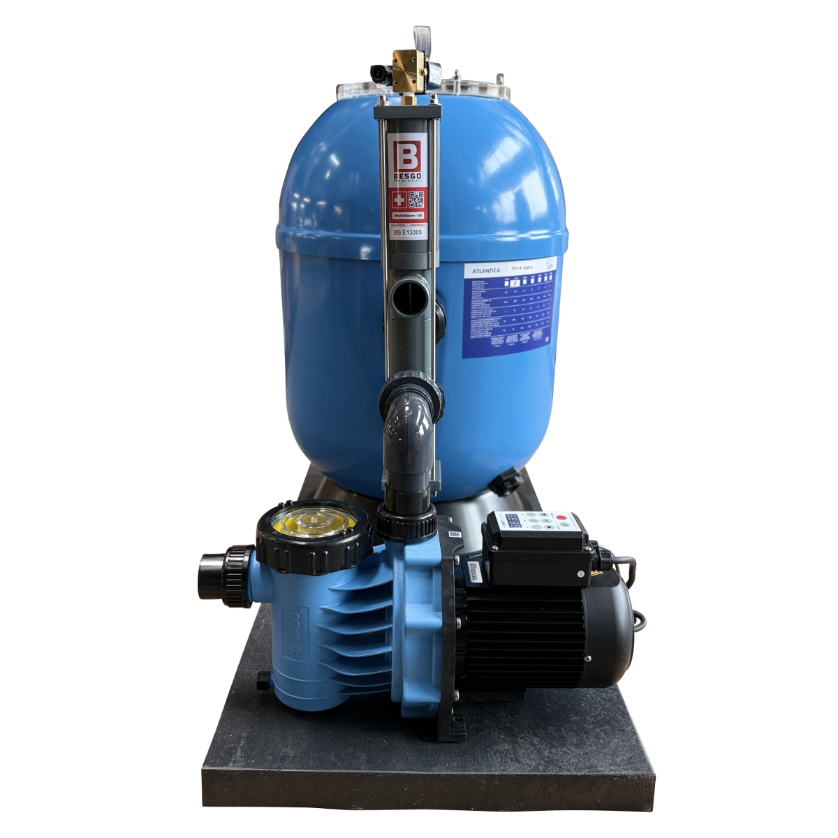 Die GFK Sandfilteranlage Atlantica Ø 510 mm mit BESGO 5-Wege-Stangenventil und BADU Alpha ECO Soft Pumpe ist eine leistungsstarke und hochwertige Lösung für die zuverlässige Poolfiltration.