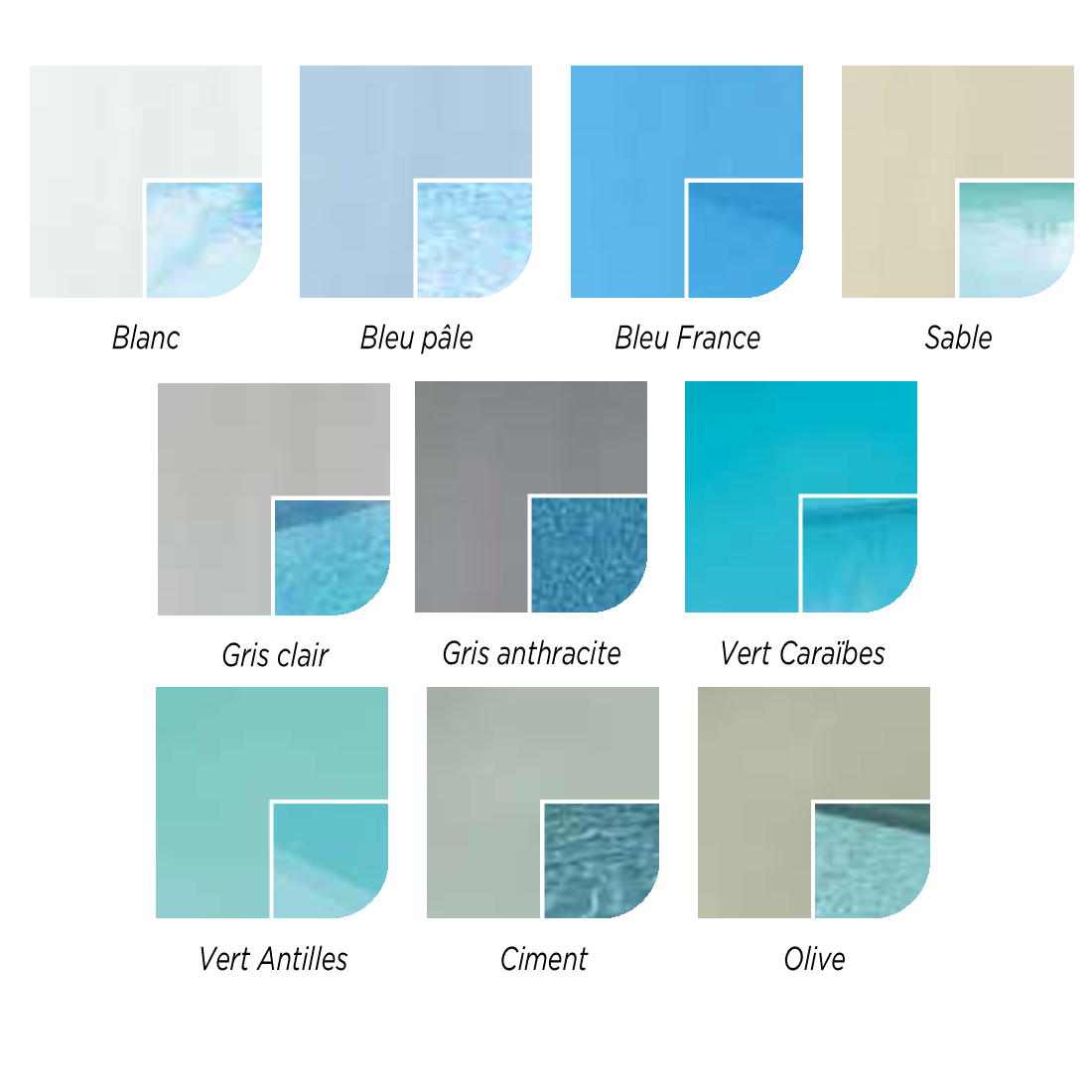 Weiss, Hellblau, Französischblau, Sand, Hellgrau, Anthrazitgrau, Schwarz*, Karibikgrün, Antillengrün, Zement, Oliv
